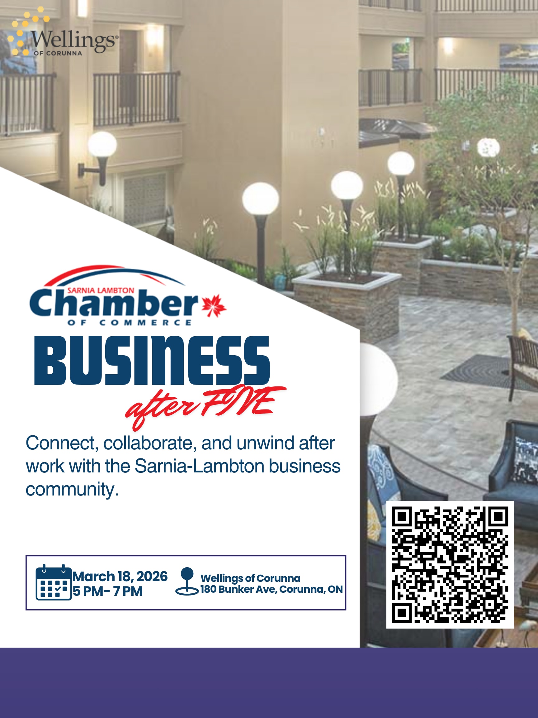 Join the Sarnia Lambton Chamber of Commerce for Business After Five at Wellings of Corunna on March 18 from 5:00–7:00 PM. This popular networking event is a great opportunity to connect with local business leaders, build new relationships, and strengthen your professional network in a relaxed and social environment. We look forward to seeing you there!