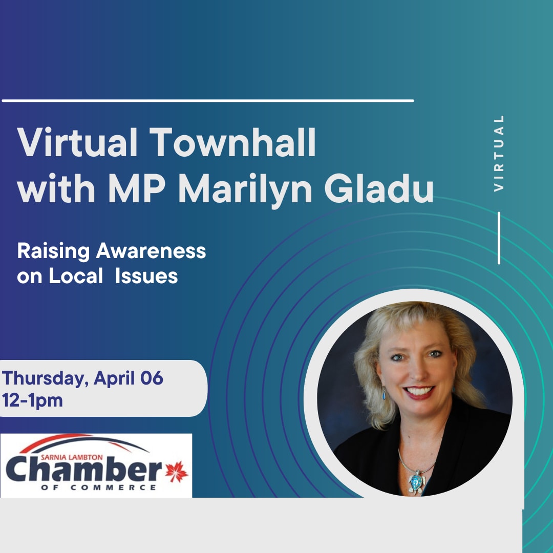 Join us April 6 between 12pm - 1pm for a virtual Town Hall with MP Marilyn Gladu to discuss what is happening in Sarnia Lambton. Submit your questions for discussion to info@slchamber.ca by March 31st, 2023.