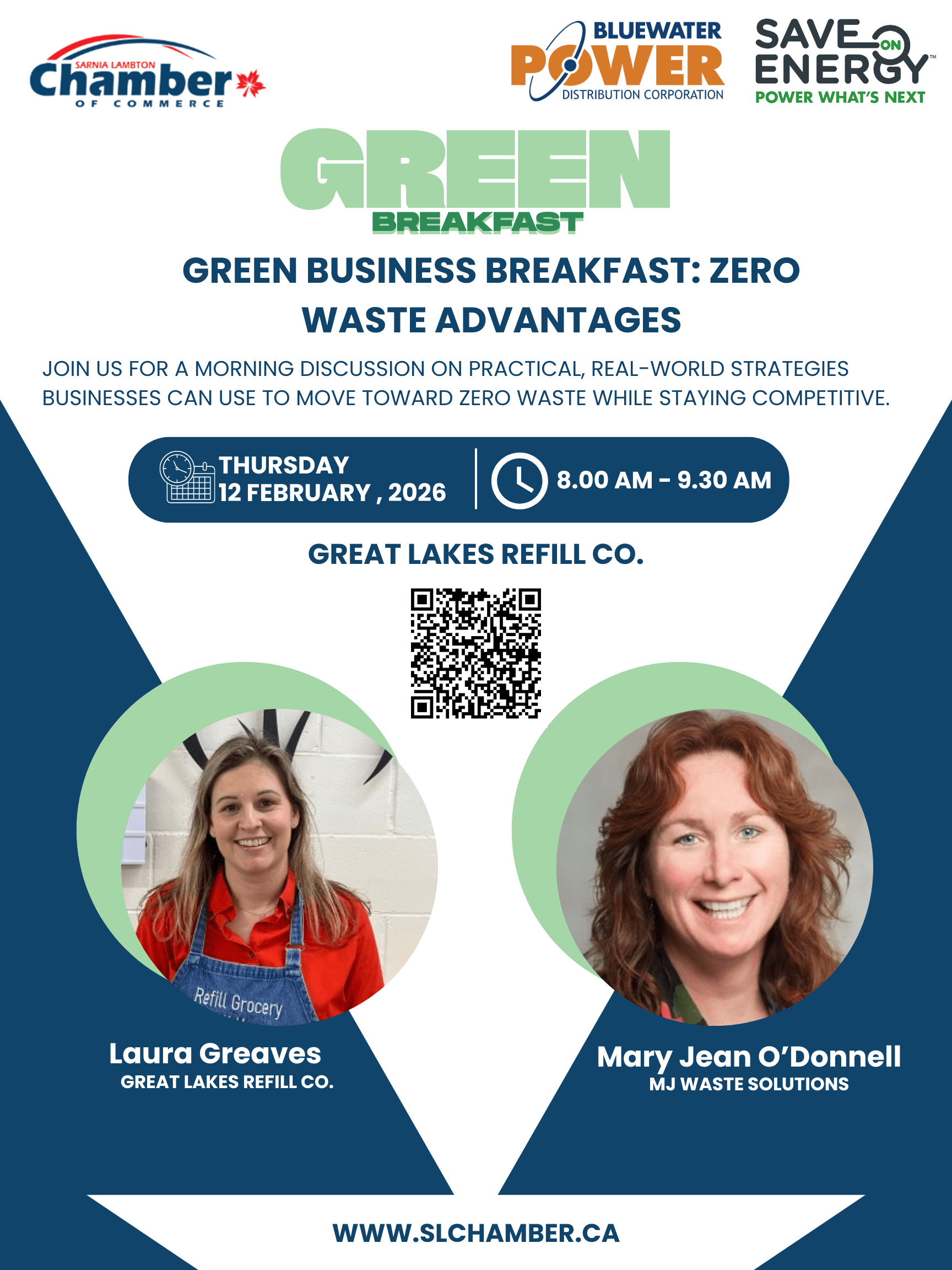 Join us for our Green Business Breakfast, proudly sponsored by Bluewater Power, featuring a morning discussion on the advantages of green business practices and zero-waste strategies. This session will explore how sustainable approaches can help businesses reduce costs, improve efficiency, and strengthen their brand while making a positive environmental impact.