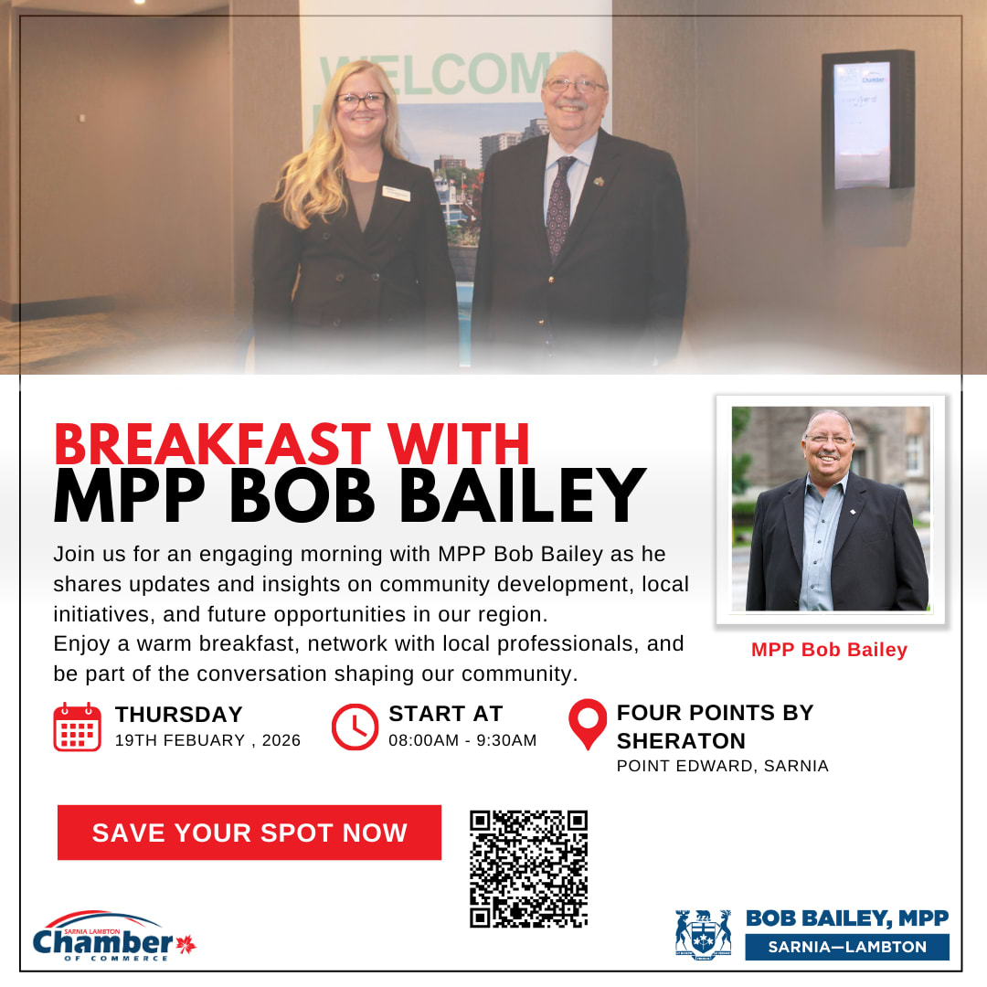 Join us for Breakfast with MPP Bob Bailey and start your morning with valuable insights and meaningful conversation. Hear updates on community development, local initiatives, and future opportunities that impact businesses and residents across Sarnia–Lambton. This event is a great opportunity to enjoy a warm breakfast, connect with local professionals, and engage directly with your provincial elected representative on issues shaping our region.