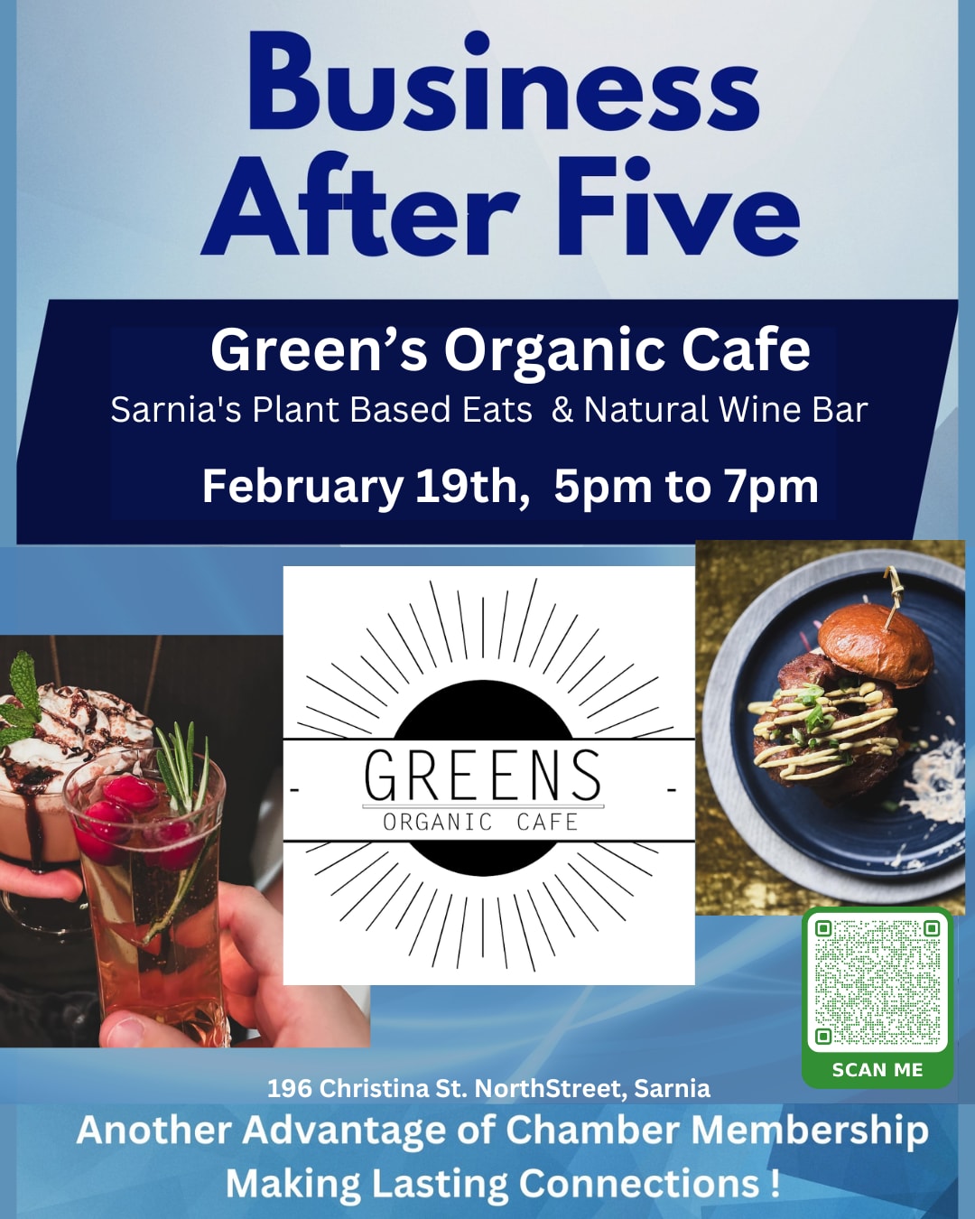 Join us for February's Business After Five at Green's Organic Cafe! Bring your friends and colleagues to enjoy this beautiful space and indulge in their delicious treats. And don't forget to bring your networking game!