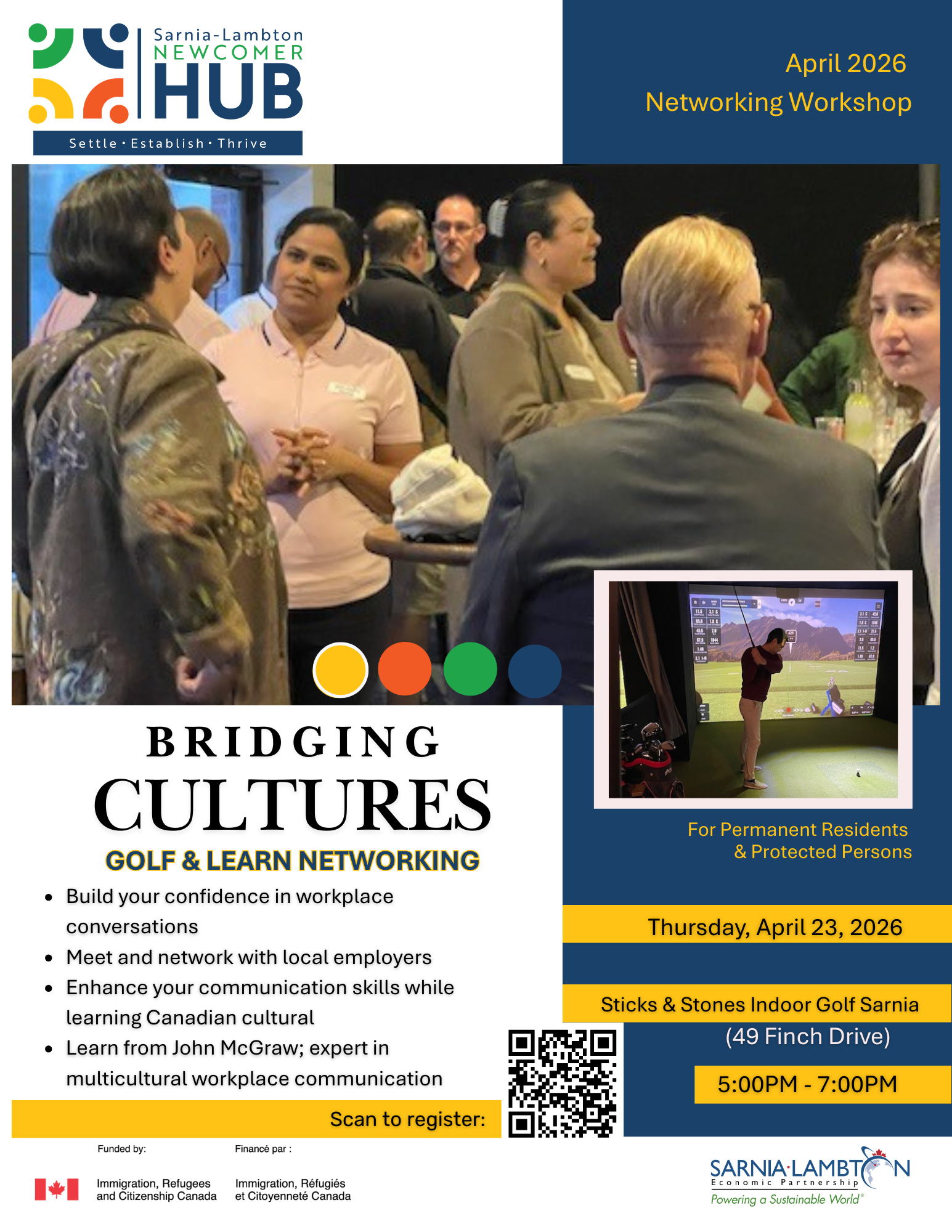 Back by popular demand, the Sarnia-Lambton Newcomer Hub is excited to announce the first golf and learn, networking event of 2026! Calling all employers and newcomers: Join us for an unforgettable exploration of bridging cultures in a Canadian workforce.