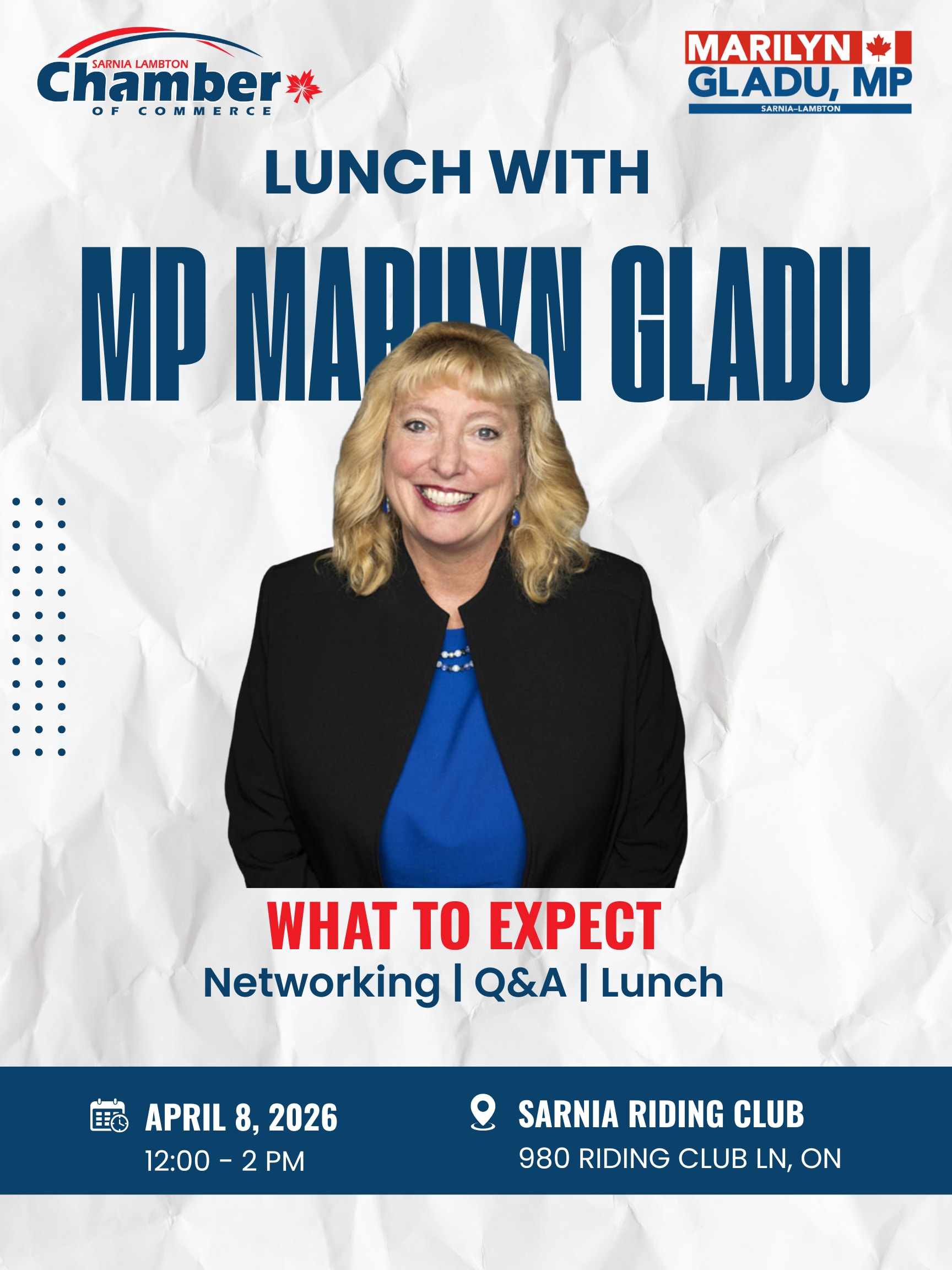 Join the Sarnia Lambton Chamber of Commerce for an engaging Lunch with Marilyn Gladu, Member of Parliament for Sarnia–Lambton.