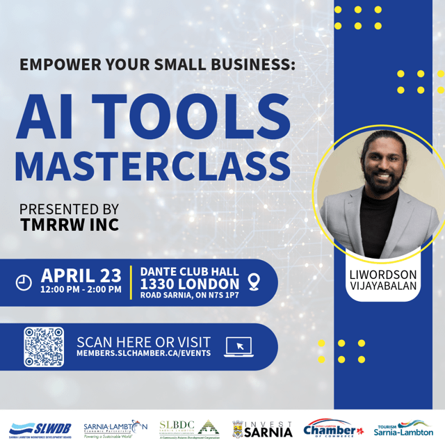 Join this masterclass on AI presented by the TMRRW INC team! This incredible opportunity is brought to you by the Sarnia Lambton Business Task Force and will be held at the Dante Club, April 23, from 12pm to 2pm.