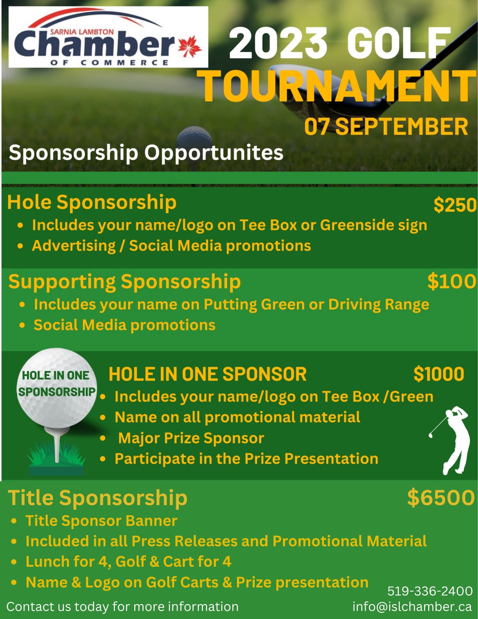 The Chamber of Commerce Golf Tournament is Back! Join us at the newly renovated Sarnia Golf & Curling Club September 7th for a great day of Golf, prizes and fun! Don't miss the early bird registration giving you a chance to win your teams enter fee!