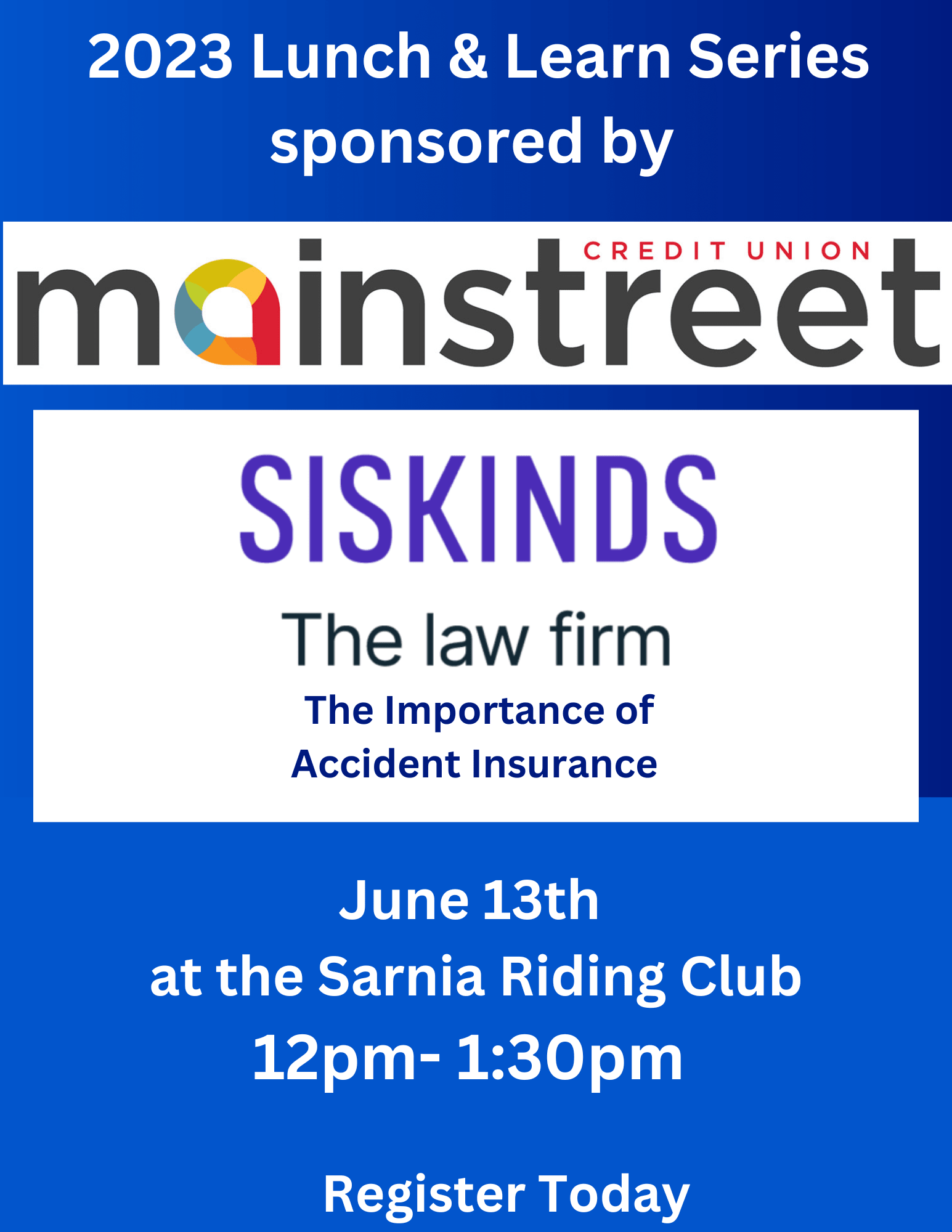 Join us at the Sarnia Riding Club for the next Lunch & Learn. Siskinds the law firm's Victoria Edwards will take us through the importance of Accident Insurance for business owners. There will be a Q&A session afterwards for any questions you might have.