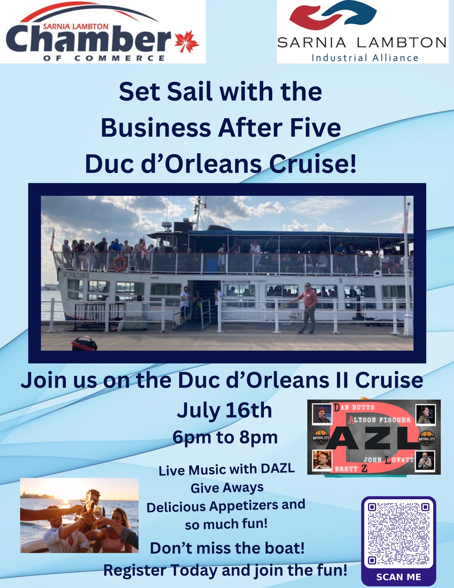 Join the Chamber and Sarnia Lambton Industrial Alliance as we set sail on the Duc d'Orléans II for a Business After Five River Cruise like no other! Enjoy live music by DAZL, delicious appetizers by Chef Paresh, exciting prizes, and—most importantly—amazing company.