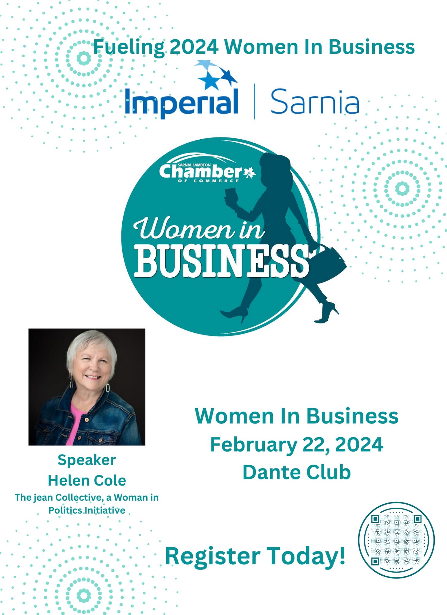 The Chamber's Women In Business is a group of exceptional people, and we welcome entrepreneurs, employees and business owners, and future Chamber Members to our events. Our 2024 series is sponsored by our incredible community partner, Imperial Sarnia Site, and on February 22nd our speaker will be Helen Cole, founder of The Jean Collective.
