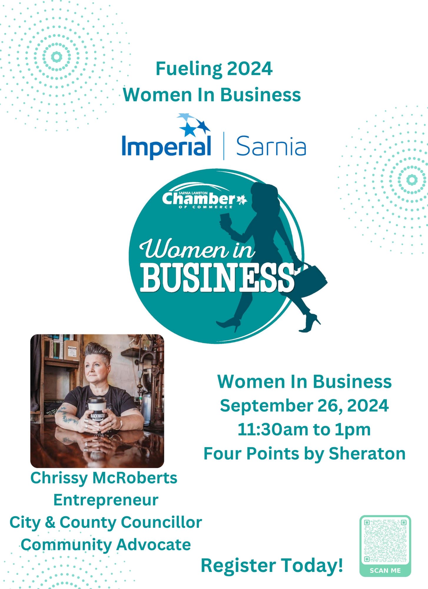 Join us at the Chamber's Women in Business event, where we support and celebrate the personal and professional achievements of women in Lambton. Our keynote speaker for September will be Chrissy McRoberts, a City of Sarnia & County of Lambton Councillor and passionate community advocate.